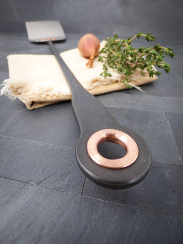Cet ustensile fut créé dans un seul but; celui d'enrichir votre expérience culinaire. L'art y rejoint la fonctionnalité dans un riche assemblage de matériaux, couleurs, textures et techniques. Cette spatule pour le grill entièrement forgés à la main en fer et cuivre est aussi décorative que fonctionnelle. Elle sera à son meilleur fièrement exhibée au mur de la cuisine ou à la main d'un maître du grill.
